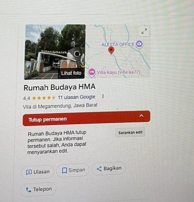 Kali ini bukan kerikil yang dilemparkan, melainkan sesuatu yang lebih serius—lebih berdampak. “Rumah Budaya HMA” tiba-tiba “diambil” dari Google. Jejak digitalnya lenyap. Seolah rumah itu tak pernah ada, tak pernah berdiri, tak pernah menjadi ruang hidup bagi para penggiat seni dan budaya.