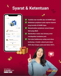 “DAMRI terus berupaya memberikan pengalaman perjalanan yang lebih sederhana, aman, dan relevan dengan kebutuhan masyarakat. Loyalty Point bukan hanya fitur baru, tetapi cara DAMRI memberi nilai tambah kepada pelanggan yang setia menggunakan layanan kami. Semakin sering bepergian dengan DAMRI Apps, semakin banyak manfaat yang bisa dinikmati,” ujarnya.