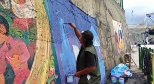 Peserta mural sedang asik menggores warna menjadi gambar.