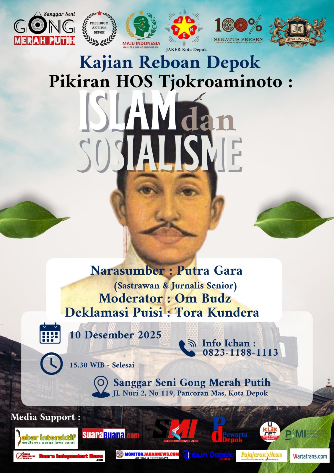 Acara ini didukung oleh Presidium Aktivis Depok, Jaker Depok, Seratus Persen, Persaudaraan Jurnalis Muslim Indonesia, dan beberapa media partner antara lain Jabar Interaktif, Suara Buana, SMI, Uklik Net, Pajajaran News, Wartatrans, Tribun Depok, SI News, Arah Merdeka, dan banyak lagi.*** (FT/Septi)