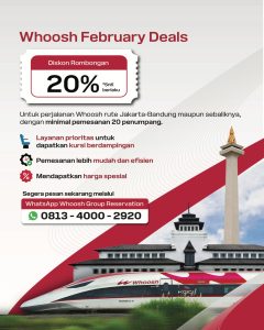 “Whoosh February Deals dihadirkan untuk mendorong masyarakat agar semakin banyak yang memanfaatkan layanan rombongan Whoosh. Selain memberikan keuntungan lebih hemat dengan diskon 20 persen, proses pemesanan juga dibuat lebih mudah karena dapat dilakukan melalui layanan WhatsApp,” ujar Eva.