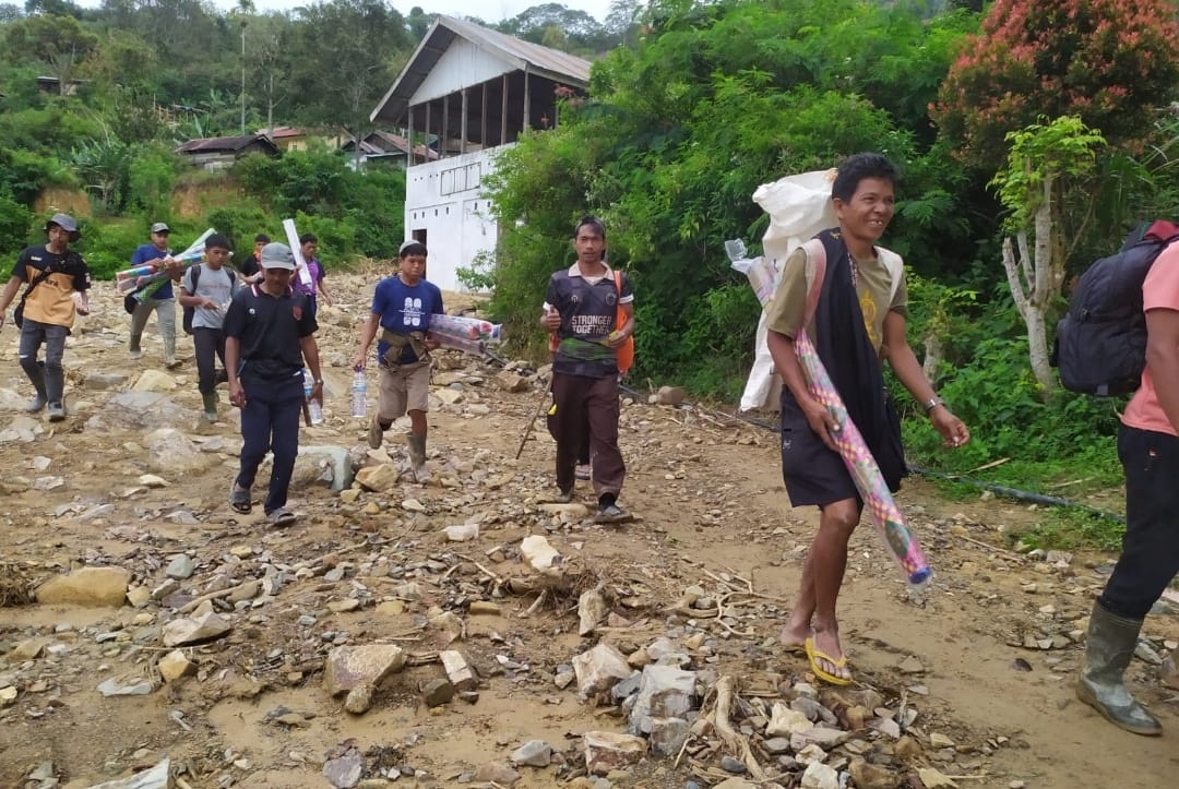 Para relawan membawa perangkat Starlink dari posko utama guna membuka akses komunikasi, khususnya di pos tengah Desa Atu Payung. Upaya ini menjadi vital mengingat keterbatasan jaringan di wilayah tersebut.
