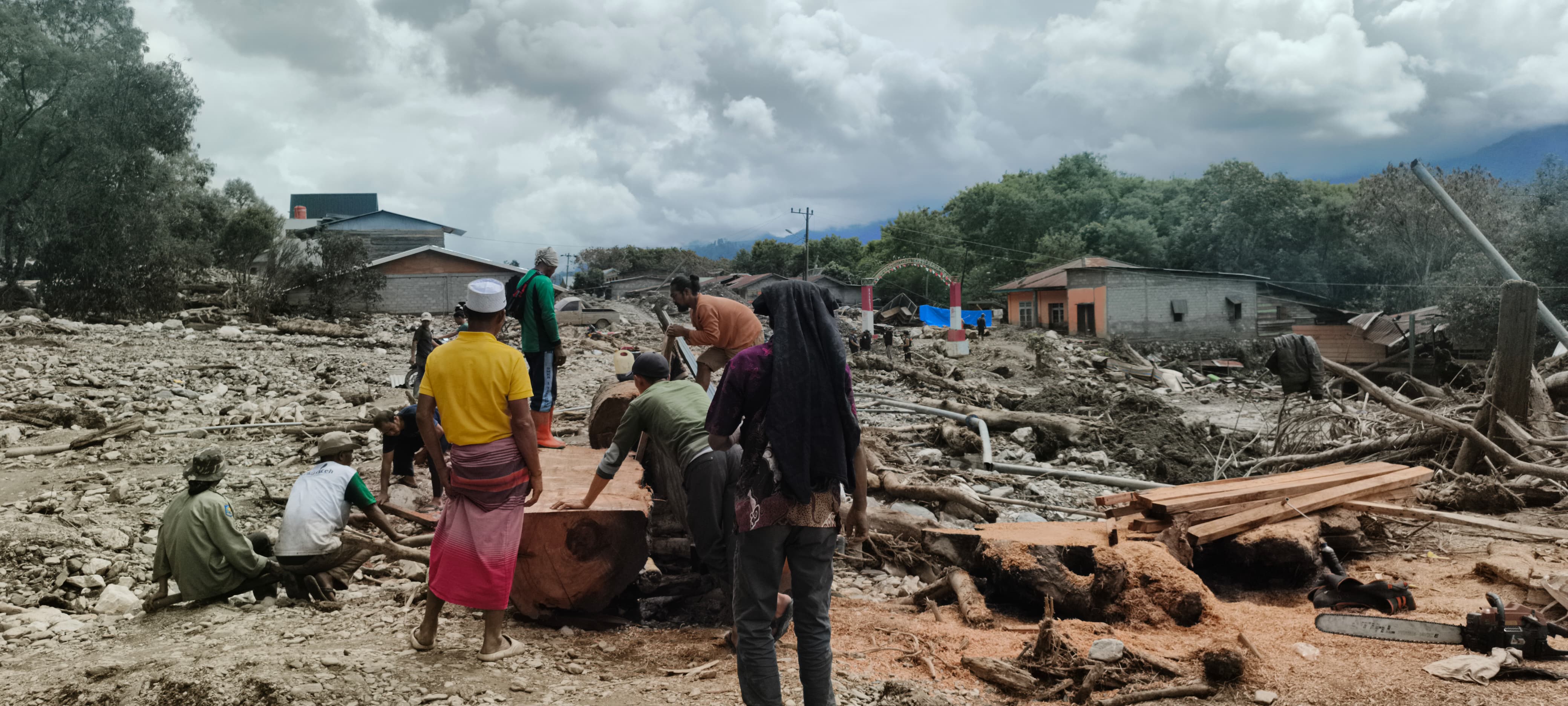 Proses pengumpulan bahan kayu turut dibantu oleh alat berat milik setempat, yang digunakan untuk memindahkan kayu-kayu besar dari timbunan batu koral sisa material banjir bandang. Kayu-kayu tersebut sebelumnya terbawa arus deras dari pegunungan saat bencana terjadi.